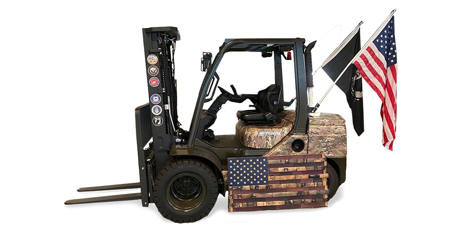 Toyota Material Handling paid tribute to U.S. Veterans by building a camoflauge forklift that bears the symbols of major military branches and over 50 Associates who served.